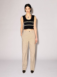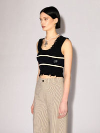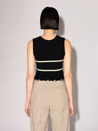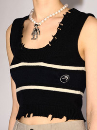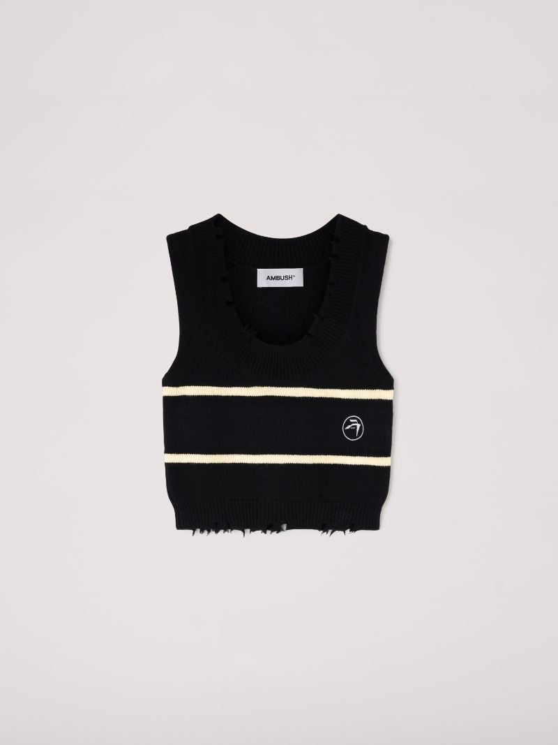This scoop-neck knit vest features a sportive stripe across the chest, the 'AMBLEM' logo at the front and distressed details. Product ID: BWHT003F24KNI0011031 SIZING Model Tat wears size S Height: 5’ 11” (180 cm) Bust: 31.5” (80 cm) Waist: 24" (63 cm)