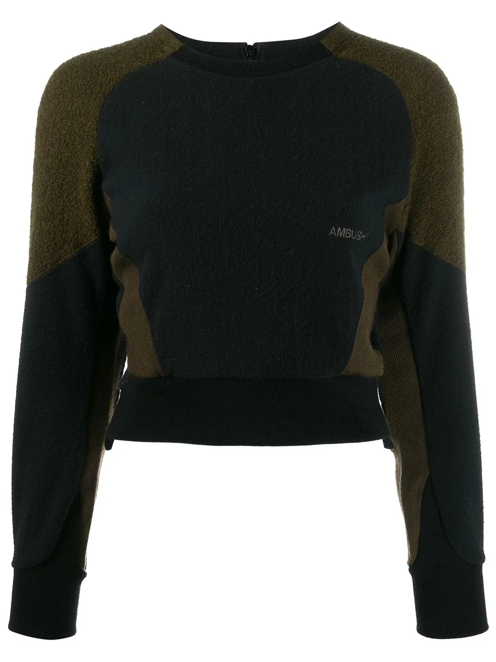 fleece panel sweatshirt Black and green wool blend fleece panel sweatshirt from AMBUSH featuring a crew neck, long sleeves, a contrast embroidered logo at the chest, a ribbed hem and cuffs and a cropped length. Imported Composition Polyester 100%, Wool 85%, Nylon 15% SIZE & FIT Model measurements Height 5 ft 10 in(1.78 m) Bust/Chest 27.95 in(71 cm) Hips 35.82 in(91 cm) Waist 24.01 in(61 cm) FittingInformation This piece fits true to size. We recommend you get your regular size Cut for a relaxed fit Made with a mid-weight fabric Washing instructions Dry Clean Only