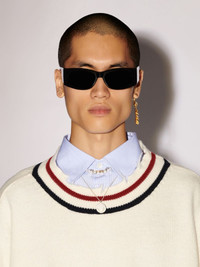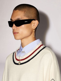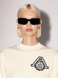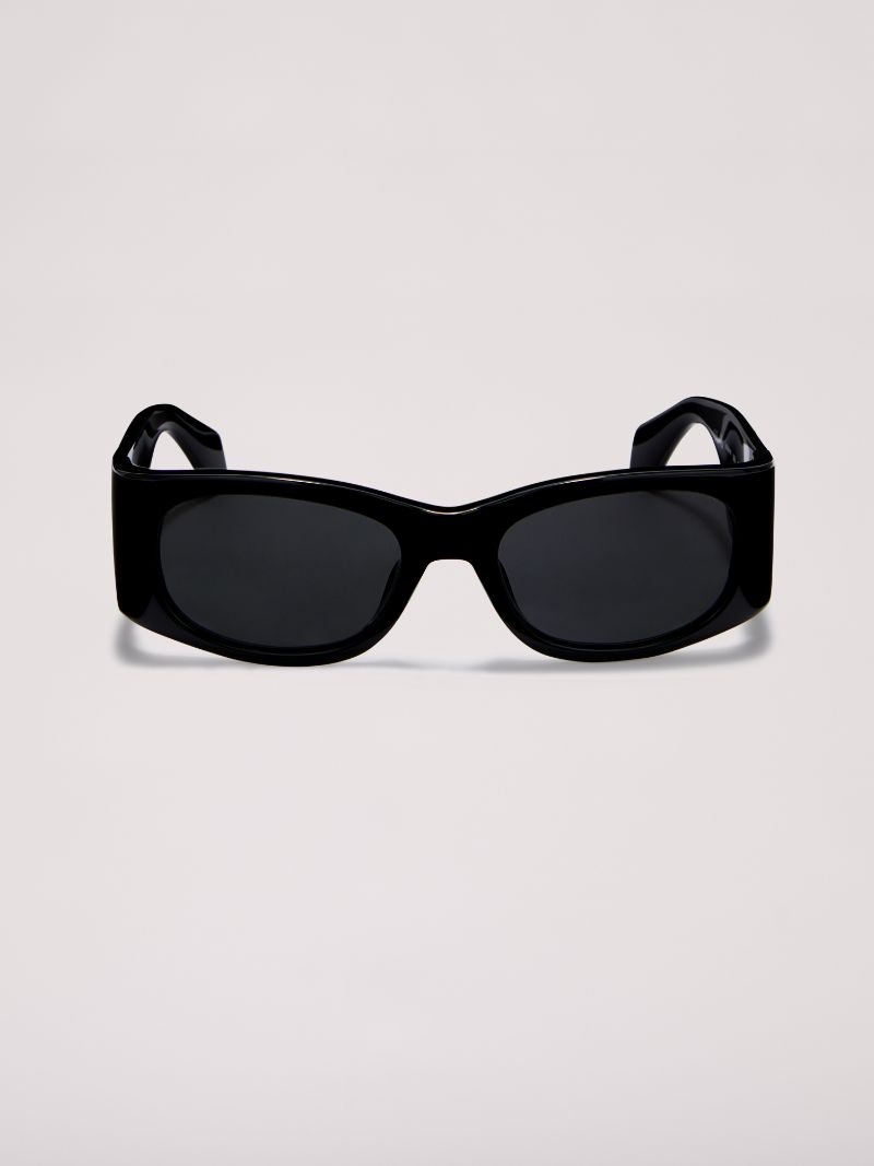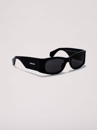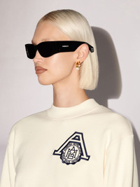 The rectangular "GAEA" sunglasses in black feature black lenses. The frame is accented with the AMBUSH® logo printed on the side. Product ID: BERI00AS24PLA0011007
