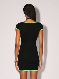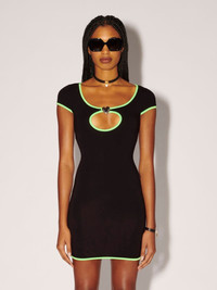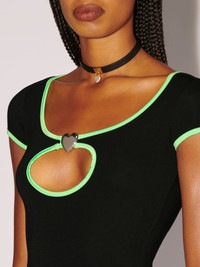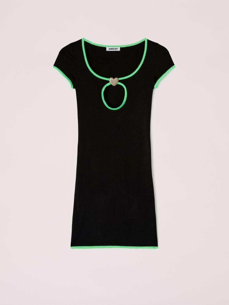 The black mini dress features a cut out detail on its chest, green trims, as well as a silver heart charm. Product ID: BWDB043S23JER0011054 SIZING MODEL HARLEY WEARS SIZE XS HEIGHT: 5’ 11” (180 CM) BUST: 32” (82 CM) WAIST: 24” (61 CM) HIPS: 35” (89 CM) MATERIAL FABRIC 7% ELASTAN