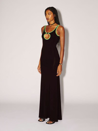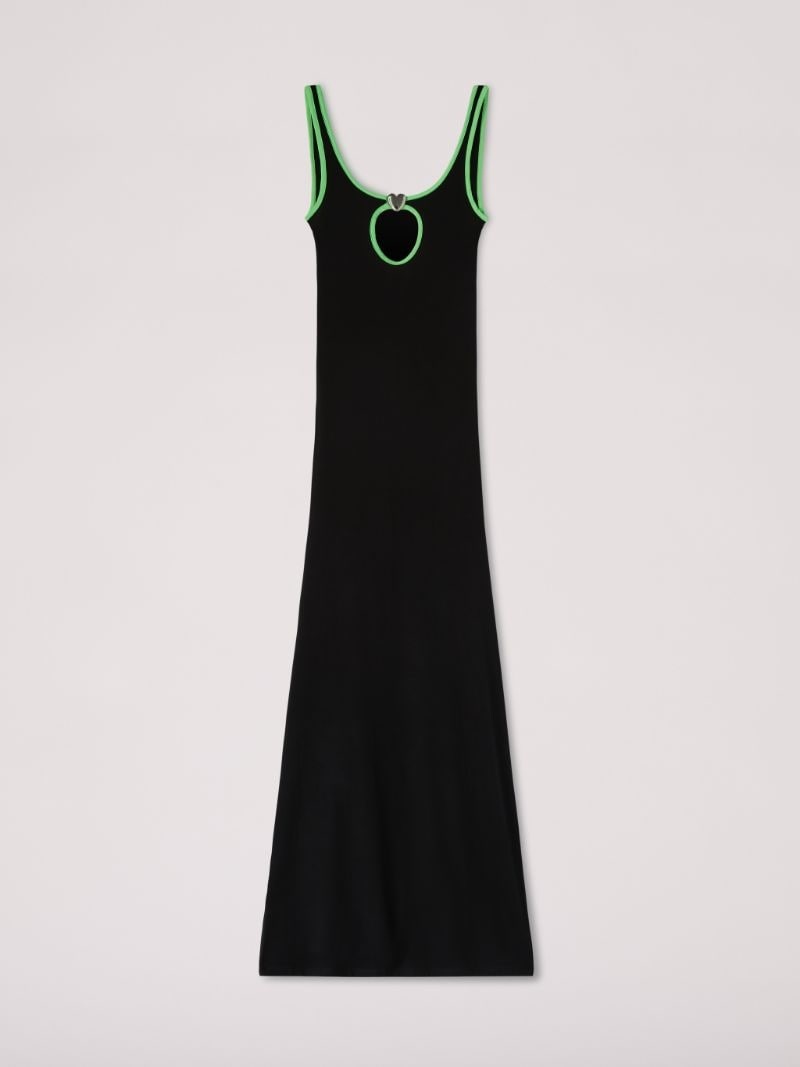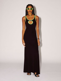 The black maxi dress features a cut out detail on its chest, green trims, as well as a silver heart charm. Product ID: BWDB044S23JER0011054 SIZING MODEL HARLEY WEARS SIZE XS HEIGHT: 5’ 11” (180 CM) BUST: 32” (82 CM) WAIST: 24” (61 CM) HIPS: 35” (89 CM) MATERIAL FABRIC 7% ELASTAN