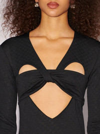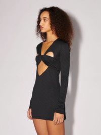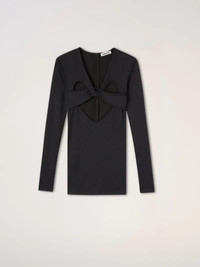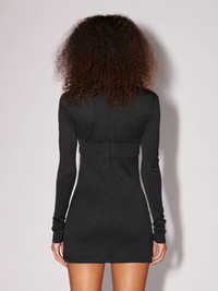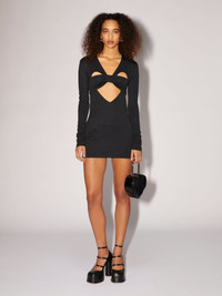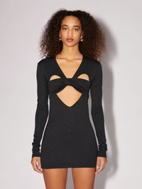 Black mini dress featuring the monogram motif all over and cut off details at the front. Product ID: BWDB026F22JER0011010 MATERIAL FABRIC 92% VISCOSE 8% ELASTAN