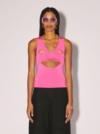 This pink, sleeveless top features heart shaped cut-out details and a wide neckline. Product ID: BWAD042S23JER0013200 SIZING MODEL HARLEY WEARS SIZE XS HEIGHT: 5’ 11” (180 CM) BUST: 32” (82 CM) WAIST: 24” (61 CM) HIPS: 35” (89 CM) MATERIAL FABRIC 8% ELASTAN