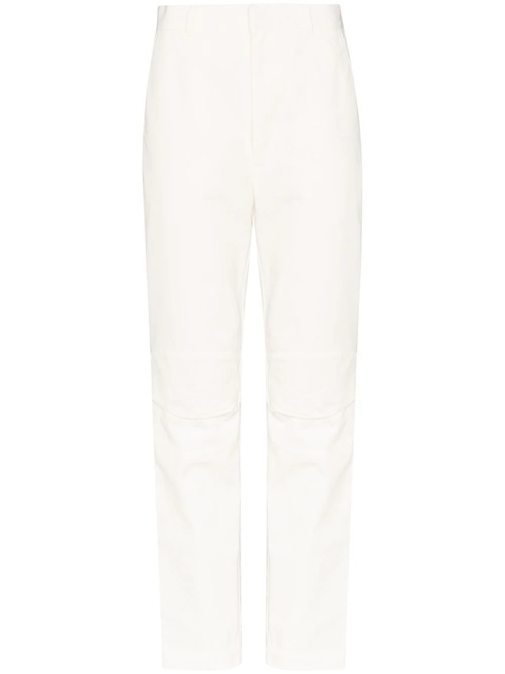 high-waisted slim-fit trousers Whiter than clouds and as crisp as cotton, these high-waisted trousers from AMBUSH are sure to become the hero of your SS20 wardrobe. But you might want to steer clear of red wine. Just in case. Featuring a high waist, belt loops, a concealed front fastening, side slit pockets, rear welt pockets, a straight leg and a regular length. Imported Composition Cotton 100% Washing instructions Hand Wash