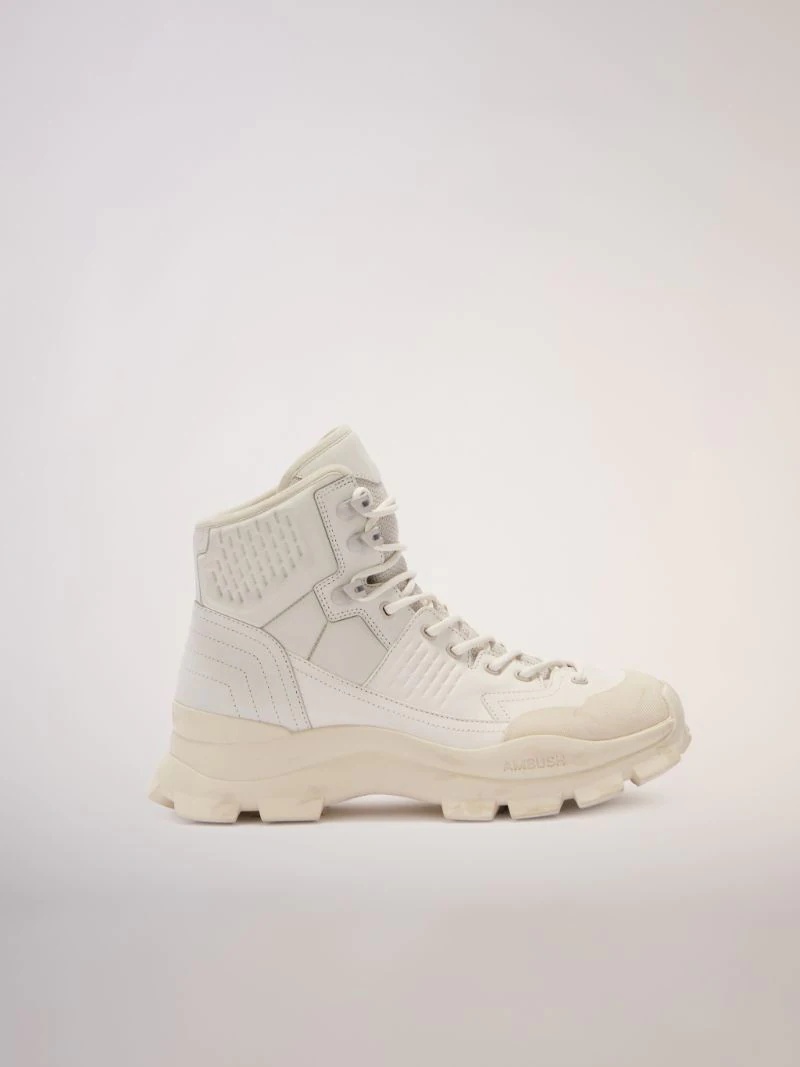 White hiking boots with AMBUSH® logo detail at the side, white laces and a hiking sole. Product ID: BWIE007F22LEA0016161 MATERIAL LINING 100% COTTON - SOLE 100% RUBBER - UPPER SHOE 25% LYCRA 30% POLYVINYL CHLORIDE 45% LEATHER