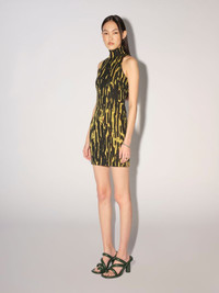 The sleeveless, fitted dress features an all over yellow and black print and a turtleneck collar. Product ID: BWHI017F22KNI0016500 SIZING MODEL GERTRUDA WEARS SIZE M HEIGHT: 5’ 8” (178 CM) BUST: 31” (80 CM) WAIST: 24” (60 CM) HIPS: 35” (89 CM) MATERIAL FABRIC 99% POLYAMIDE 1% ELASTAN