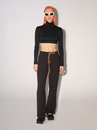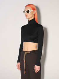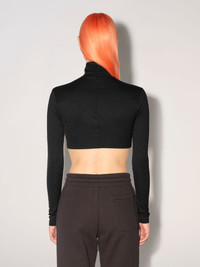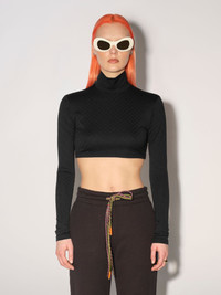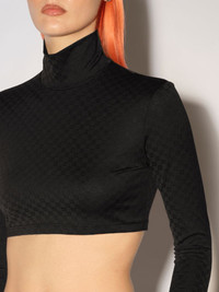 Made from polyamide and elastane, the black crop top features an all over monogram motif, long sleeves and a high collar. Product ID: BWAD041F22JER0011010 SIZING MODEL MARTINA WEARS SIZE M HEIGHT: 5’ 8” (178 CM) BUST: 33” (84 CM) WAIST: 24” (61 CM) HIPS: 35” (90 CM) MATERIAL FABRIC 95% VISCOSE 5% ELASTAN