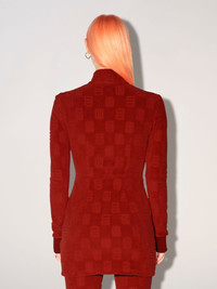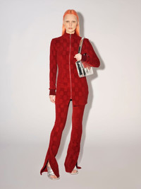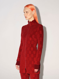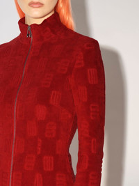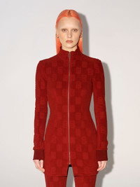 Red mini dress featuring the monogram motif all over, zip front closure, as well as a high collar and rib knit cuffs. Product ID: BWDB035F22JER0012828 SIZING MODEL MARTINA WEARS SIZE M HEIGHT: 5’ 8” (178 CM) BUST: 33” (84 CM) WAIST: 24” (61 CM) HIPS: 35” (90 CM) MATERIAL FABRIC 82% COTTON 18% POLYAMIDE