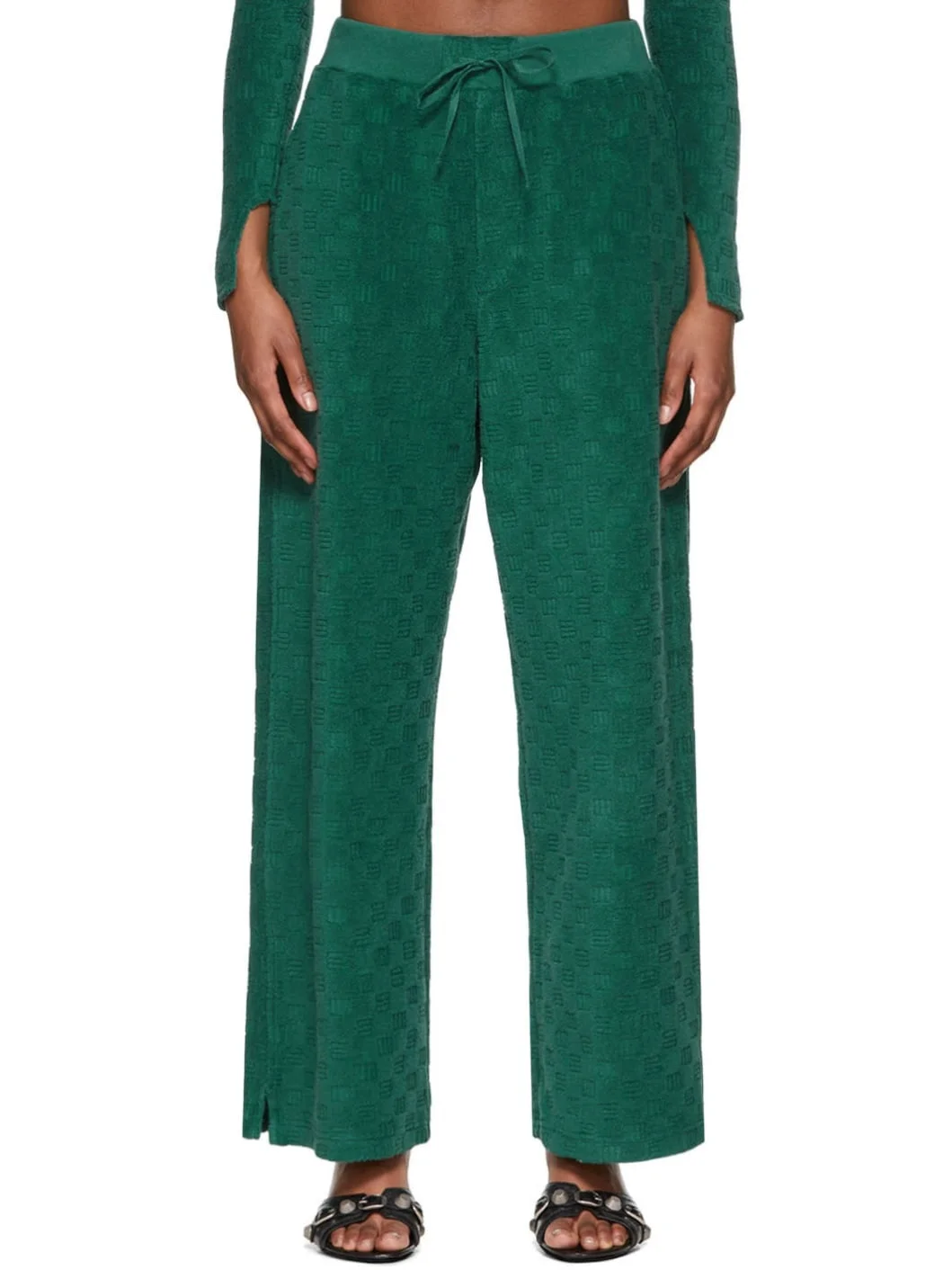 Stretch cotton and nylon-blend terrycloth lounge pants. Jacquard-woven monogram pattern throughout. · Drawstring at elasticized waistband · Two-pocket styling · Vent at cuffs Supplier color: Evergreen 79% cotton, 21% nylon.