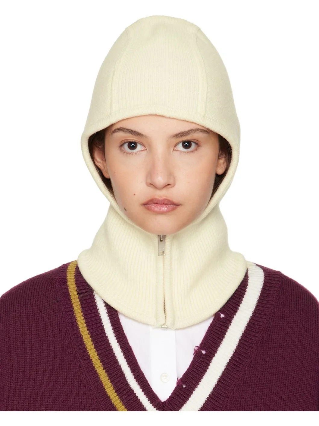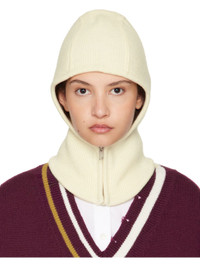 Rib-knit virgin wool balaclava in off-white. · Zip closure at neck · Silver-tone hardware Supplier color: Tofu 100% virgin wool. Made in Italy 242820F014000