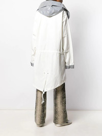 oversized hooded coat White cotton oversized hooded coat from AMBUSH featuring a front zip fastening, long sleeves, a two tone design, front flap pockets and a loose fit. Imported Composition Cotton 100% SIZE & FIT Model measurements Height 5 ft 11 in(1.8 m) Bust/Chest 31.49 in(80 cm) Hips 35.82 in(91 cm) Waist 24.8 in(63 cm) FittingInformation This piece fits true to size. We recommend you get your regular size Cut for an oversized fit Made with a mid-weight non-stretch fabric Washing instructions Dry Clean Only