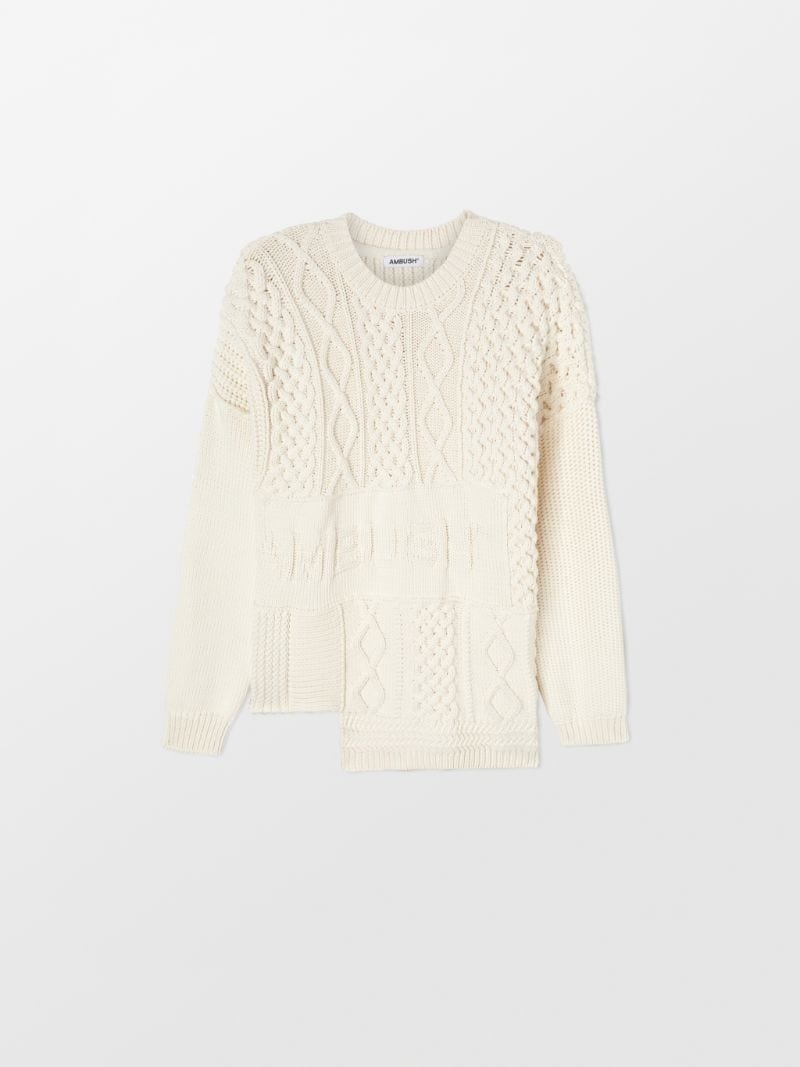 Long sleeved knitted sweater, accented with patchwork AMBUSH® logo embroidery. Product ID: BWHE015S22KNI0010100 SIZING MODEL TAN WEARS SIZE S HEIGHT: 5’ 9” (177 CM) BUST: 30” (77 CM) WAIST: 23” (59 CM) HIPS: 34” (87 CM) MATERIAL FABRIC: COTTON64% NYLON36%