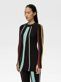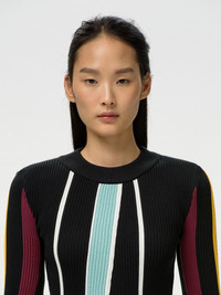 Striped, long sleeved knitted crewneck top featuring reverse weave ribbed detailing and long silhouette. Product ID: BWHF004S21KNI0011001 SIZING Model Yoonmi wears size S Height: 70" (177 cm) Chest: 32.5" (82 cm) Waist: 23"(58 cm) Hips: 35" (89 cm) MATERIAL DETAILS 60% POLYESTER 40% COTTON FABRIC 60% COTTON 40% POLYESTER