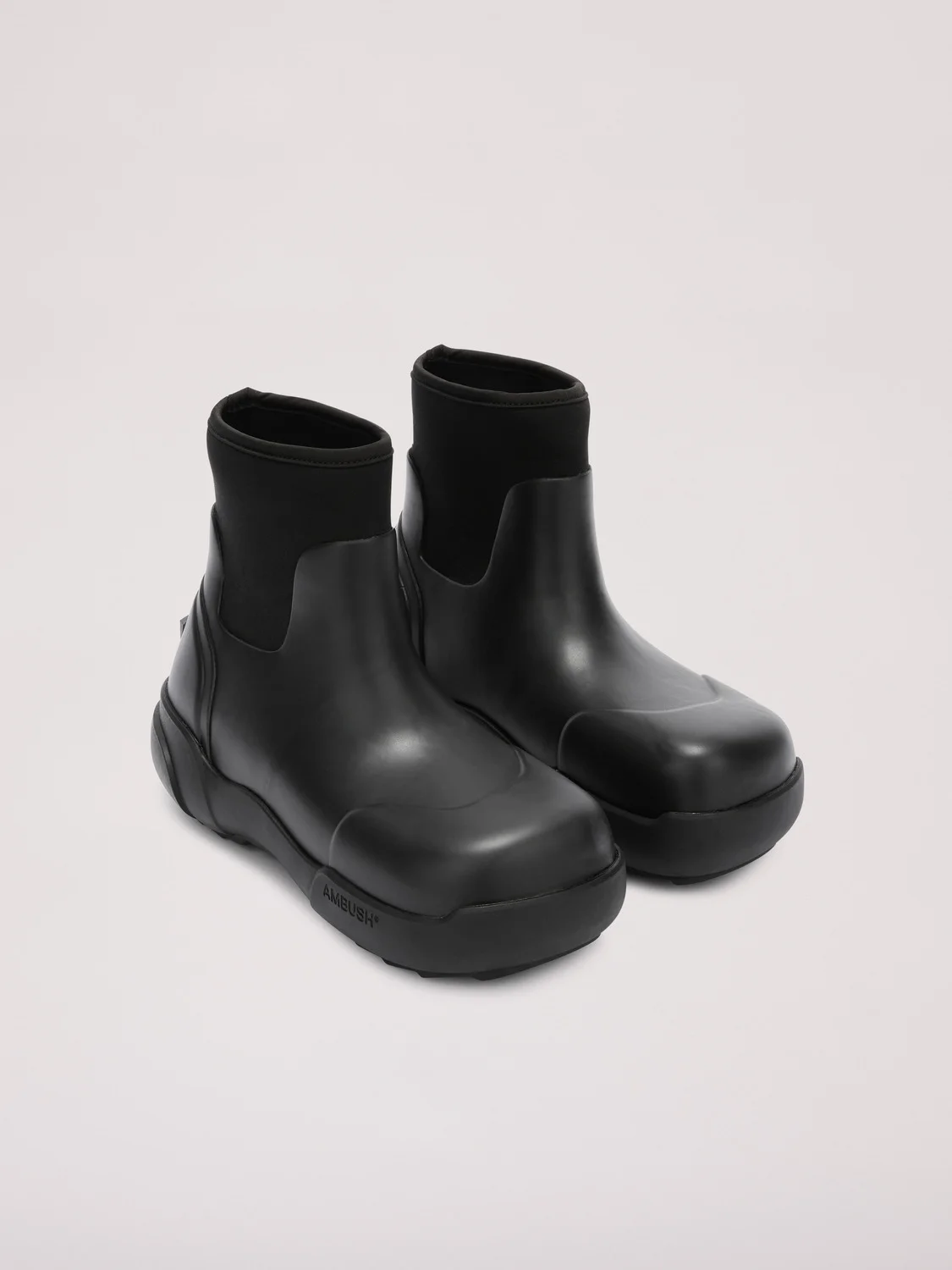 These square-toe rubber boots from AMBUSH® are designed with the brand's logo featured on the back and sides, adding a distinctive touch. The bold sole design enhances their presence, making these boots a standout piece in any collection. MATERIAL Upper: rubber, neoprene Sole: rubber