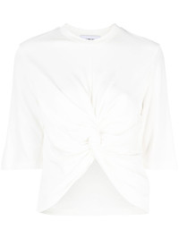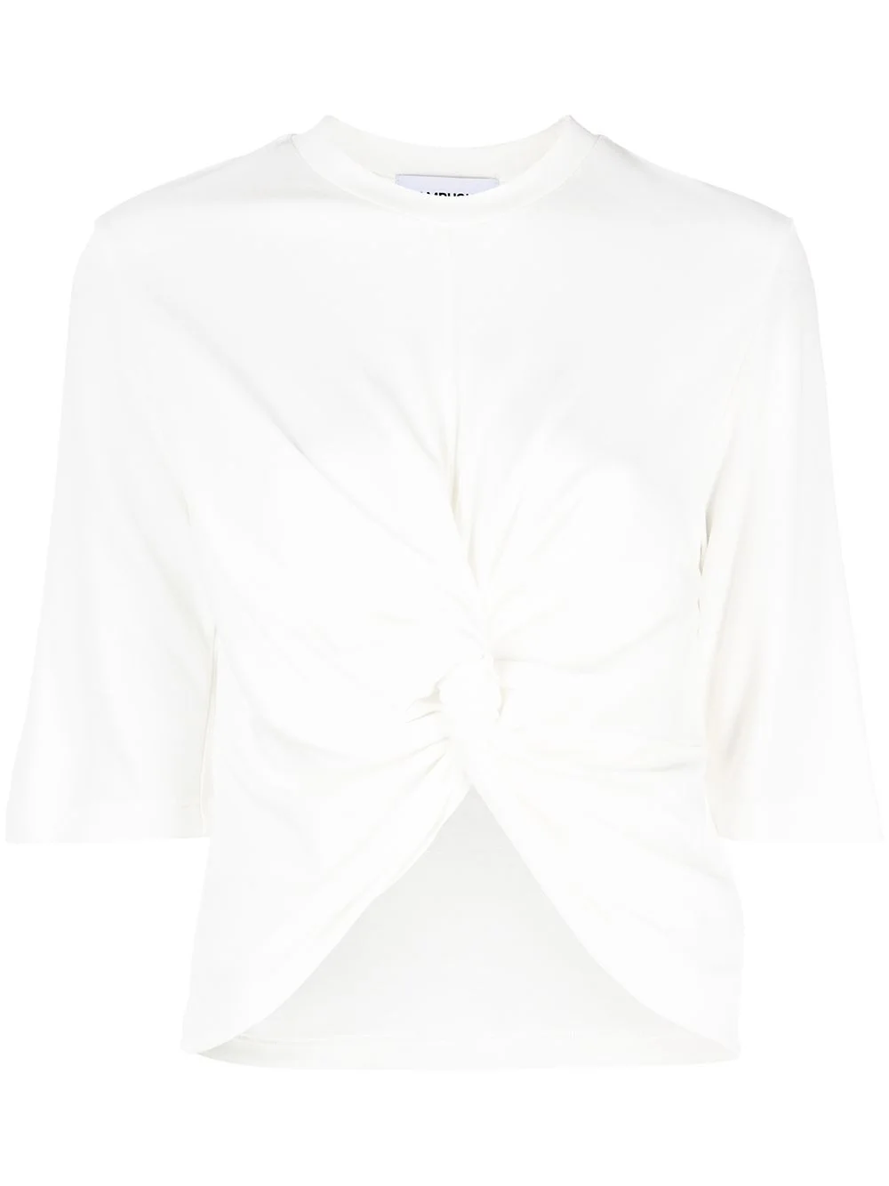 short-sleeved gathered T-shirt True friendship lives forever. And you and this white T-shirt from Ambush will be just like a knot: too tangled to be taken apart. So, make room for it. Made in Italy Composition Viscose 93%, Polyamide 7% SIZE & FIT Model measurements Height 5 ft 10 in(1.77 m) Bust/Chest 31.49 in(80 cm) Hips 36.22 in(92 cm) Waist 22.44 in(57 cm) FittingInformation This piece fits true to size. We recommend you get your regular size Cut for a relaxed fit Made with a mid-weight fabric Washing instructions Machine Wash
