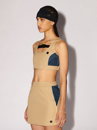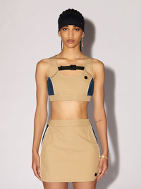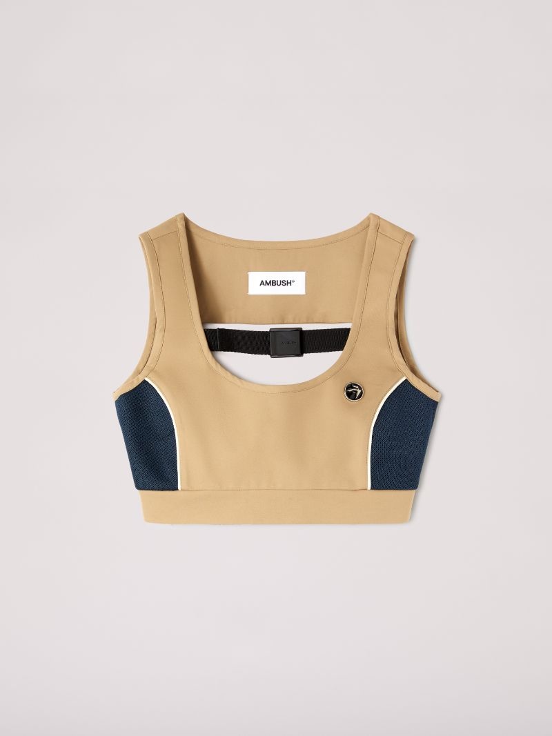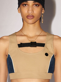 The sponge bra top features the 'AMBLEM' logo at the front and is detailed with a belted clasp. Product ID: BWAD006S24FAB0016200 SIZING Model Sophie wears size S Height: 5’ 10” (178 cm) Bust: 32.5” (82 cm) Waist: 24" (64 cm)