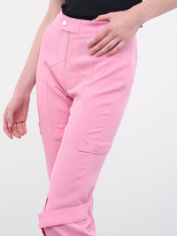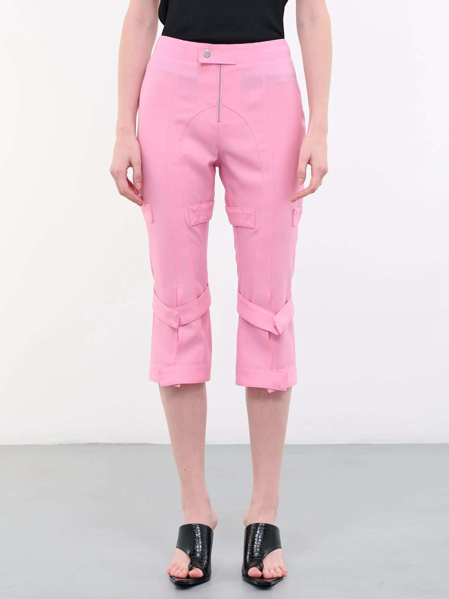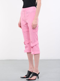 AMBUSH trousers in prink, virgin wool, mid-waist, seam detailing, press-stud fastening, leg straps, cropped, slim fit. Italian Sizing Body - 100% Virgin Wool Details - 100% Viscose Model is 5'10" wearing size 40. Bust: 32" Waist: 25" Hips: 35"