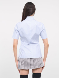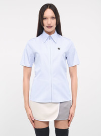 AMBUSH shirt in blue, paneled cotton construction, fine stripe pattern, pointed collar, front concealed zip closure, short sleeves, chest metal logo plaque, straight hem, slim fit. Made in Italy 100% Cotton Italian Sizing Model is 5'8" wearing size 40. Bust: 32" Waist: 26" Hips: 34.5"