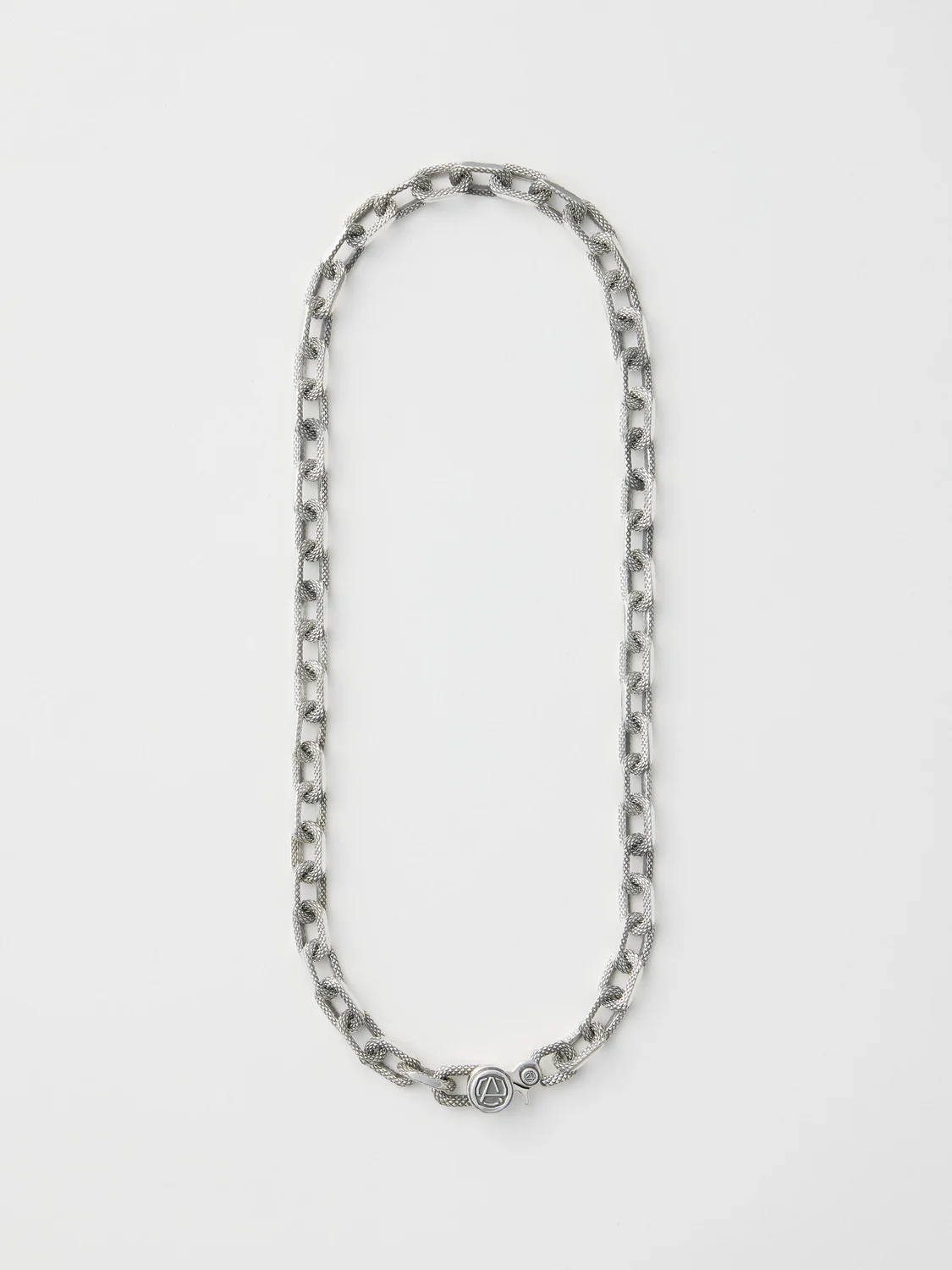 A textured link necklace featuring an aged finish that adds character and uniqueness. Crafted in uncoated silver, the piece will naturally deepen in tone over time, enhancing its individuality with wear. MATERIAL Silver925