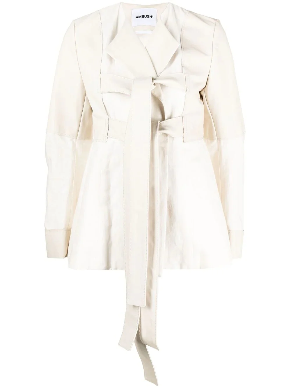 tie-front wrap blazer Suiting like you've never seen it before. Turning tailoring on its head, Ambush has reinvented the jacket with this piece and its strappy design. Remember, nothing is ever as it seems. Made in Italy Composition Leather 100%, Linen/Flax 55%, Cotton 45% SIZE & FIT Model measurements Height 5 ft 11 in(1.8 m) Bust/Chest 31.1 in(79 cm) Hips 34.25 in(87 cm) Waist 22.83 in(58 cm) Washing instructions Specialist Cleaning
