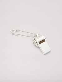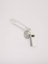 A whistle charm is suspended from the classic safety pin pierce. Sold as single piece. Whistle is functional and makes sounds when you blow on it. Product ID: BMOD001S24SIL0017200