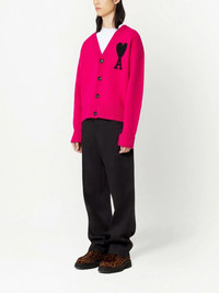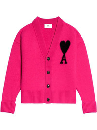 Ami de Coeur wool cardigan AMI Paris' signature Ami de Coeur logo, translating as 'Ami of hearts', is a reinterpretation of the ace of hearts, expressing the brand's playful nature. Spun from soft virgin wool, this cardigan features the motif at the chest in contrasting black against its lively pink construction. Highlights - Pink/black - Virgin wool - Signature ami de coeur monogram motif - Knitted construction - V-neck - Front button fastening - Long sleeves - Ribbed cuffs - Ribbed hem - When buying this unisex item, keep in mind that it is graded in standard men's sizing. Made in Italy Composition Virgin Wool 100%