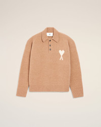 Polo in alpaca knit. Limited Edition - Ami Holidays Capsule Unisex product "ami" engraved horn buttons Long sleeves Intarsia knitted Ami de Coeur on the chest Interlock stitch 64 cm center back length (size M) 58 cm center back length (size XS) Made in Italy (with love) REF: UPL416.KN0135.287 SIZE & FIT This style is unisex and it's design to be worn oversize. Take your normal size. Woman model is 181 cm / 5"9 and is wearing a size XS. Man model is 182 cm / 5"9 and is wearing a size M. COMPOSITION & CARE GUIDE Main Material : 50% Alpaca 25% Wool 23% Polyamide 2% Elastane Chlorine prohibited Do not tumble dry Dry flat Dry clean gentle Cool iron Wash inside out Contains non-textile parts of animal origin Hand wash low temperature
