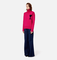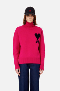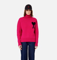 Product Description Fuchsia pink wool Ami de Coeur roll-neck jumper from AMI Paris featuring signature Ami de Coeur monogram motif, roll neck, long sleeves, drop shoulder and ribbed hem. When buying this unisex item, keep in mind that it is graded in standard men's sizing..