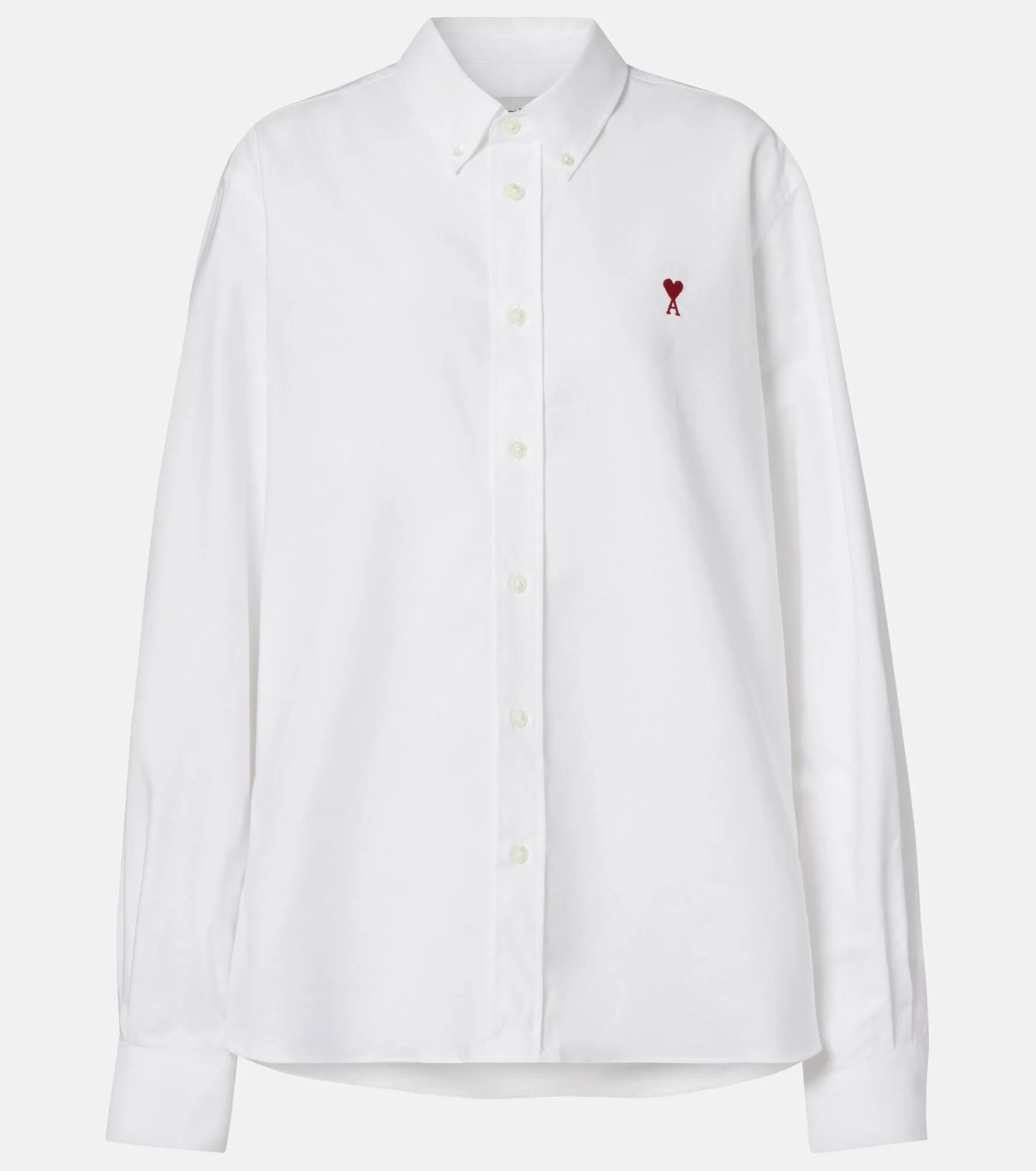 A symbol of Ami Paris since 2016, the Ami de Cœur logo is named after the French expression for "friend of the heart". It's embroidered at the heart of this shirt, made from crisp cotton poplin. Product Details - Material: 100% cotton - Care instructions: machine wash at 30 degrees - Made in Poland - Designer color name: Blanc Naturel - Item color: white - Collar: classic (Straight point) - Closure: button-down - Cuff: one button - Item number: P01074086 Size & Fit - Fits large to size - we recommend trying one size smaller - Dropped shoulders - Designed for a loose fit - Non-stretchy fabric - Falls below the hip - The model seen in the picture is 178cm-5'10" and wearing a size XXS