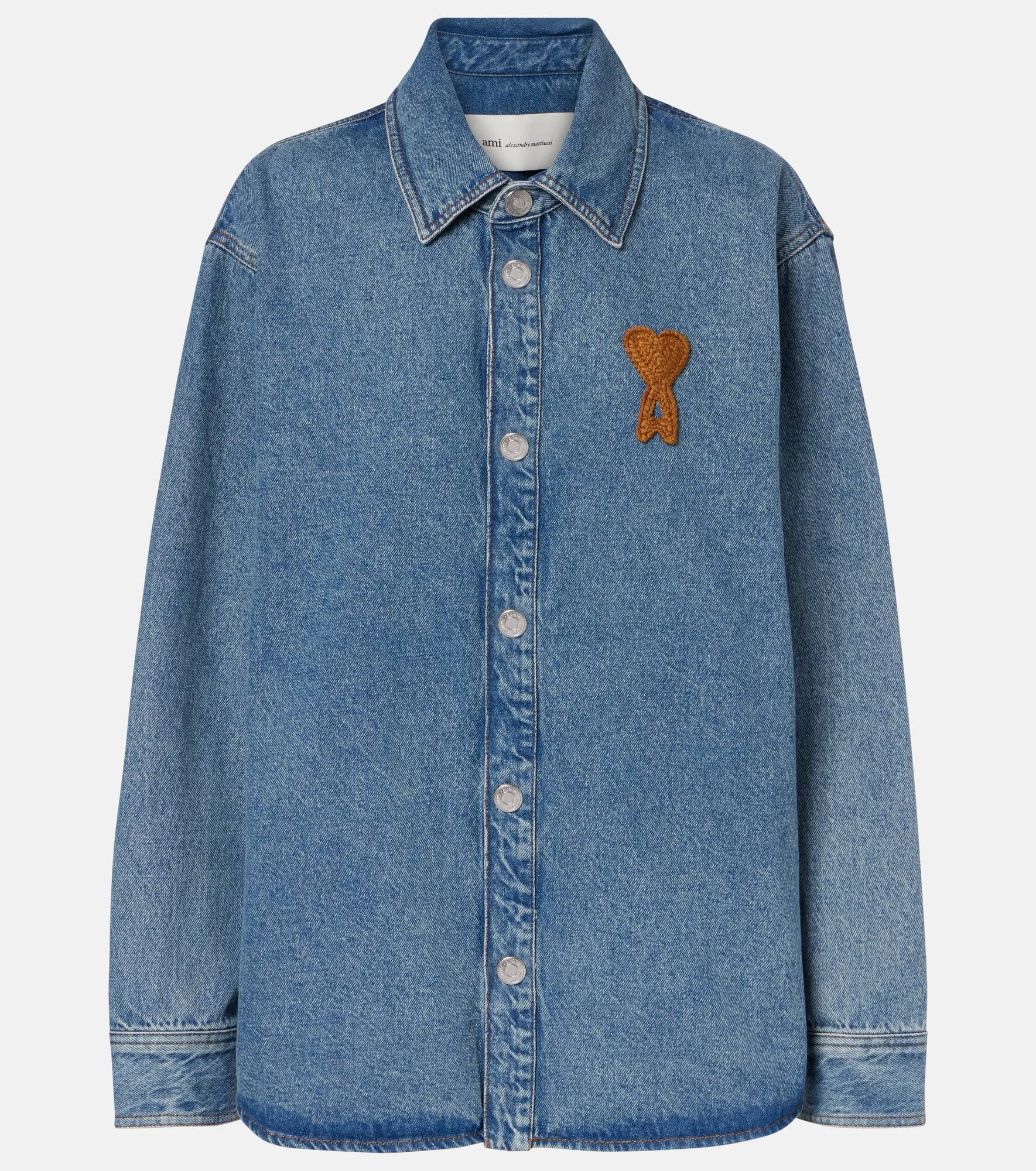 A symbol of Ami Paris since 2016, the Ami de Cœur logo is named after the French expression for "friend of the heart". This denim shirt boasts a relaxed fit with the signature logo at the chest. Product Details - Material: 100% cotton - Care instructions: machine wash at 30 degrees - Made in Portugal - Color: blue - Designer color name: Bleu Used - Collar: classic (Straight point) - Closure: snap-buttoned front - Item number: P01144834 Size & Fit - True to size - Dropped shoulders - Oversized - Non-stretchy fabric - Falls below the hip - The model seen in the picture is 178cm-5'10" and wearing a size XS