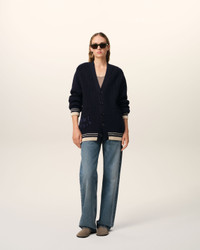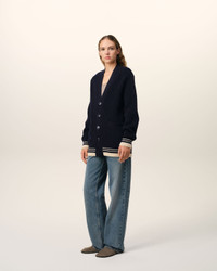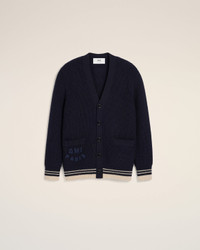 Cardigan in college ribs wool. Unisex product Half english ribs stitch "AMI Paris" knitted patch embroidered under right pocket Ami de Coeur knitted patch embroidered on the back under collar 73 cm center back length (size M) 59 cm center back length (size XS) Made in Portugal (with love) REF: UKC168.KN0068.4011 SIZE & FIT This style is unisex and it's design to be worn oversize. Take your normal size. Man model is 1m86 / 6'1" and is wearing a size M. Woman model is 1m80 / 5'11" and is wearing a size XS. COMPOSITION & CARE GUIDE 100% New Wool Hand wash low temperature Chlorine prohibited Do not tumble dry Dry flat Cool iron Dry clean possible