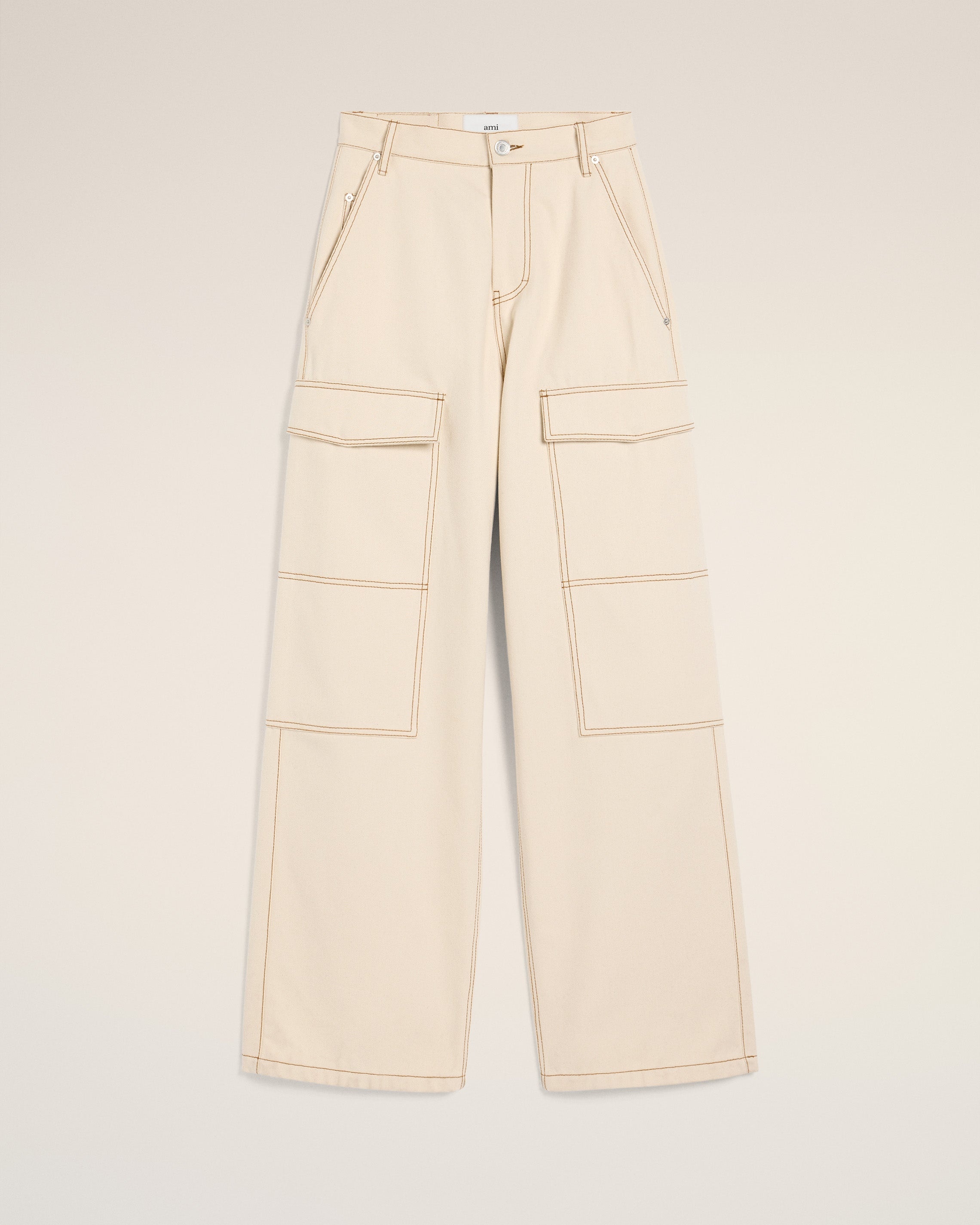 Cargo Wide fit jeans in colored cotton twill. Very large fit 30 cm bottom leg width (size 26) Classic waist Very large leg Flap pockets with invisible snap buttons Zipped fly Denim metal rivets and buttons in nickel color "ami alexandre mattiussi" patch on the back Tobacco topstitches Made in Portugal (with love) REF: FTR306.DE0039.136 SIZE & FIT This item is designed to be worn lose. Take your normal size. Model is 1m77 / 5'10" and is wearing a size 26. COMPOSITION & CARE GUIDE 100% Cotton Machine wash at 30°C Chlorine prohibited Do not tumble dry Medium iron Dry clean possible Wash with similar colours