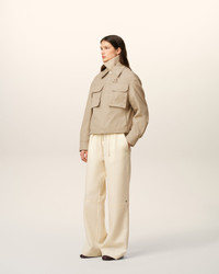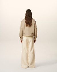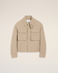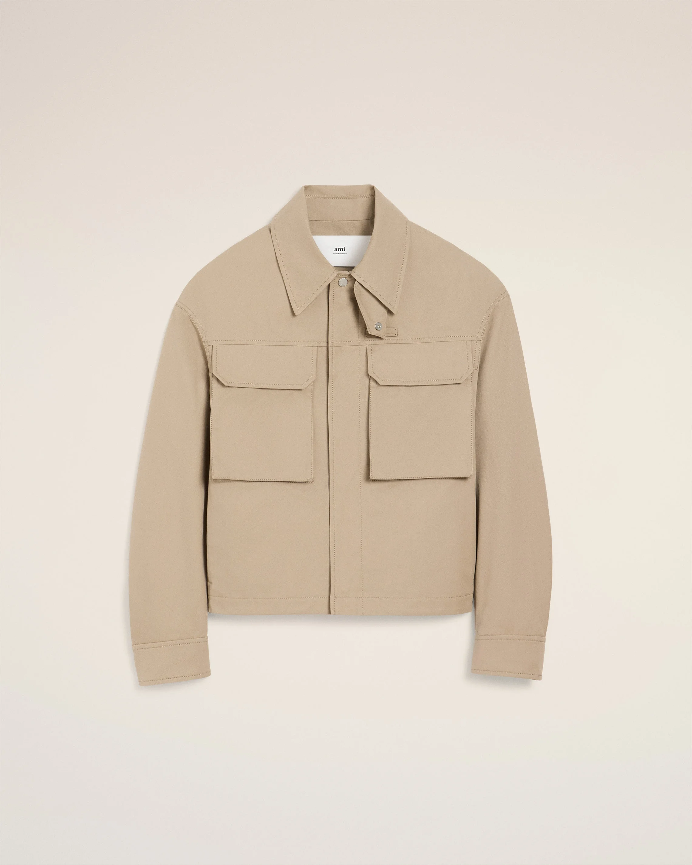 Worker jacket in cotton gabardine. Unisex product Nickel metal zipper with leather puller Front and pockets with invisible snap buttons Adjustable cuffs with snap buttons Adjustable back tabs with snap buttons "ami alexandre mattiussi" leather label on the chest 60 cm center back length (size XS) 62 cm center back length (size M) Made in Romania (with love) REF: UJK846.CO0132.229 SIZE & FIT This style is unisex. For man, take your normal size. For woman, take one size down than your usual size. Man model is 186 cm / 6"1 and is wearing a size M. Woman model is 178 cm / 5"10 and is wearing a size XS. COMPOSITION & CARE GUIDE Main Material : 100% Cotton Pocket Lining : 65% Polyester 35% Cotton Do not wash Chlorine prohibited Do not tumble dry Cool iron Dry clean gentle