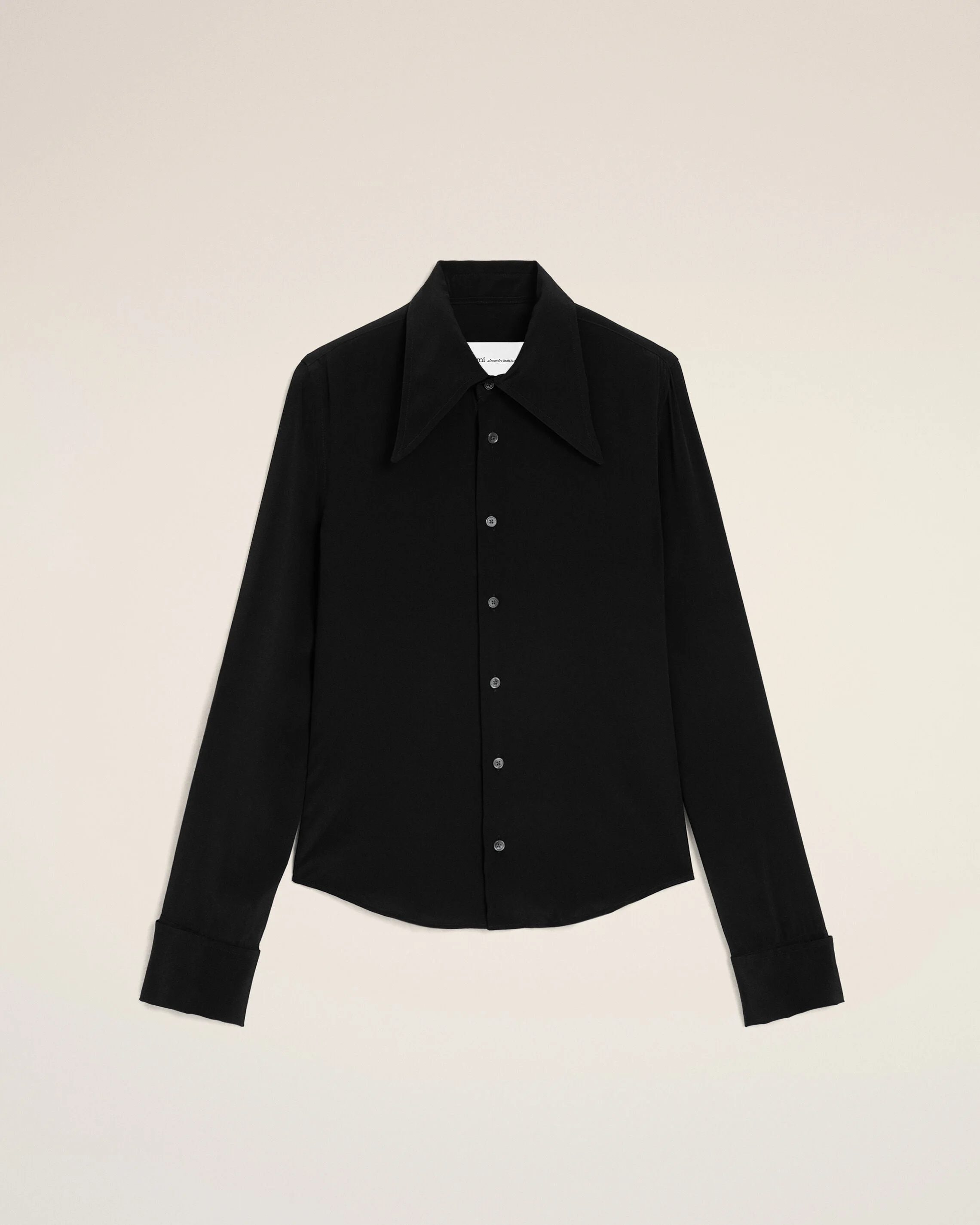 Fitted shirt with sharp collar in blended silk crepe de chine. Fitted fit Sharp collar Ami de coeur plate on the middle back Mother-of-pearl buttons on front placket Cufflinks on cuffs Made in Bulgaria (with love) REF: FSH817.AC0020.001 SIZE & FIT This item is designed for a close fit. Take your normal size. Woman model is 181 cm / 5"9 and is wearing a size 36. COMPOSITION & CARE GUIDE Main Material : 76% Acetate, 24% Silk Chlorine Prohibited Do Not Tumble Dry Dry Clean Gentle Cool Iron Do Not Wash