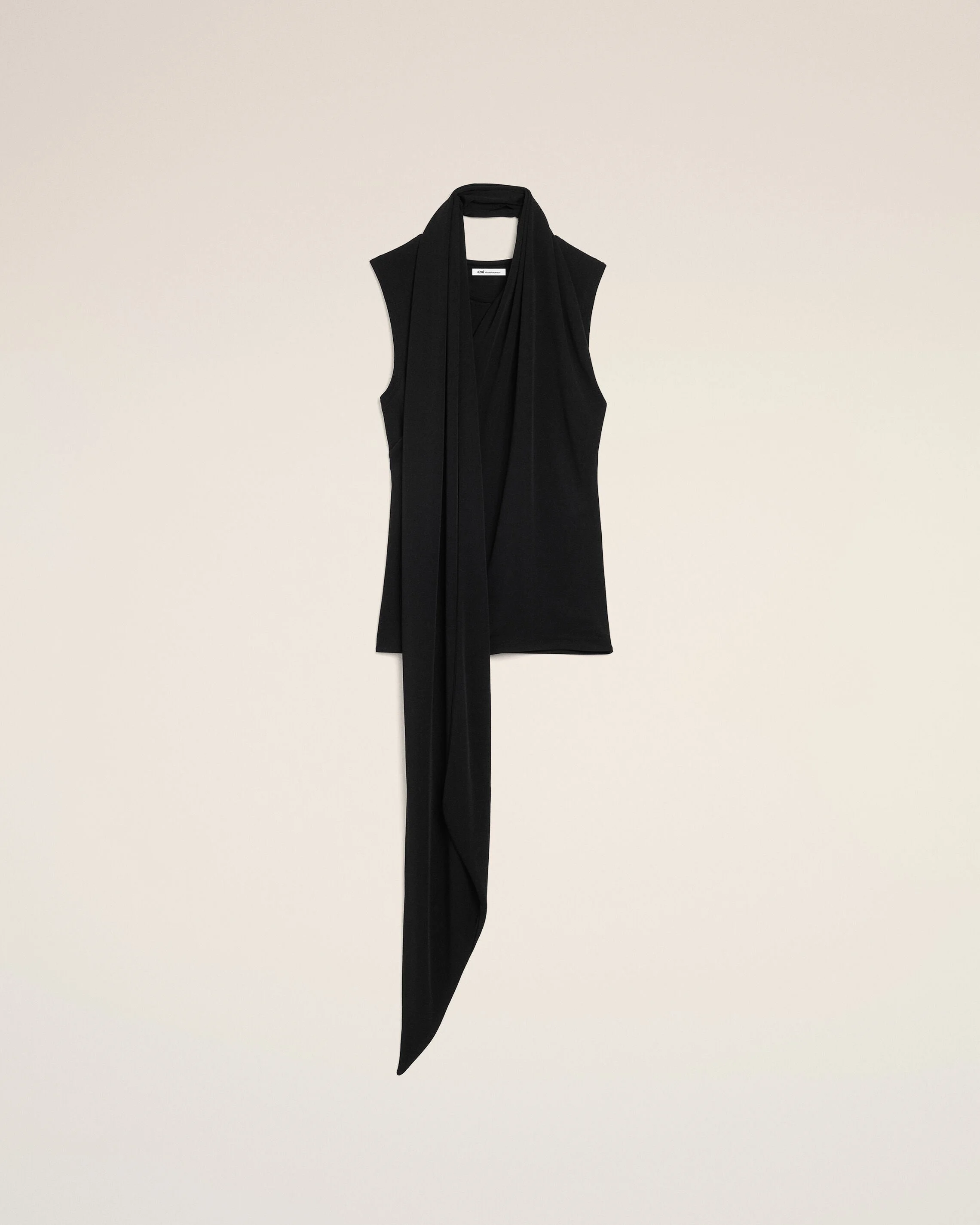 Sleeveless lavaliere top in crepe jersey. Fitted fit Scarf sewn to side seam, adjustable when worn Made in Portugal (with love) REF: FTP827.JE0223.001 SIZE & FIT Fits true to size. Take your normal size. Woman model is 181 cm / 5"9 and is wearing a size S. COMPOSITION & CARE GUIDE Main Material : 83% Viscose, 17% Polyamide Chlorine Prohibited Do Not Tumble Dry Cool Iron Hand Wash Low Temperature Dry Clean Gentle