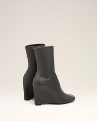 Bicolor wedge ankle boots in smooth satin leather and nubuck. Calfskin Tonal leather sole Signature wedge heel Leather covered bicolor heel Crushed velvet and smooth leather lining Ami de Coeur logo on the outsole "ami alexandre mattiussi" label in the insole Tonal zip Total heel height 85mm Made in Portugal (with love) REF: FSV819.AL0145.020 SIZE & FIT Fits true to size. Take your normal size. COMPOSITION & CARE GUIDE Main Material : 100% Cow Leather Secondary Material : 100% Cow Leather Main Lining : 100% Cow Leather Outsole : 100% Cow Leather Do not wash