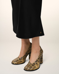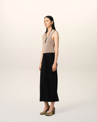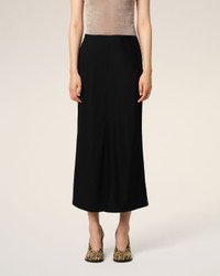 Midi skirt in viscose and acetate. Straight fit 88 cm center back length (size 36) Ami de Coeur mini plate on the bottom of the skirt Invisible zip on the side The material is used in both side to have a matte and a shinny side Made in Madagascar (with love) REF: FSK266.AC0014.001 SIZE & FIT This item is designed for a close fit. Take the next size up for a semi-fitted cut. Model is 1m79 / 5'10" and is wearing a size 36. COMPOSITION & CARE GUIDE 71% Acetate, 29% Viscose Do not wash Chlorine prohibited Do not tumble dry Cool iron Dry clean petroleum solvent only on a gentle process