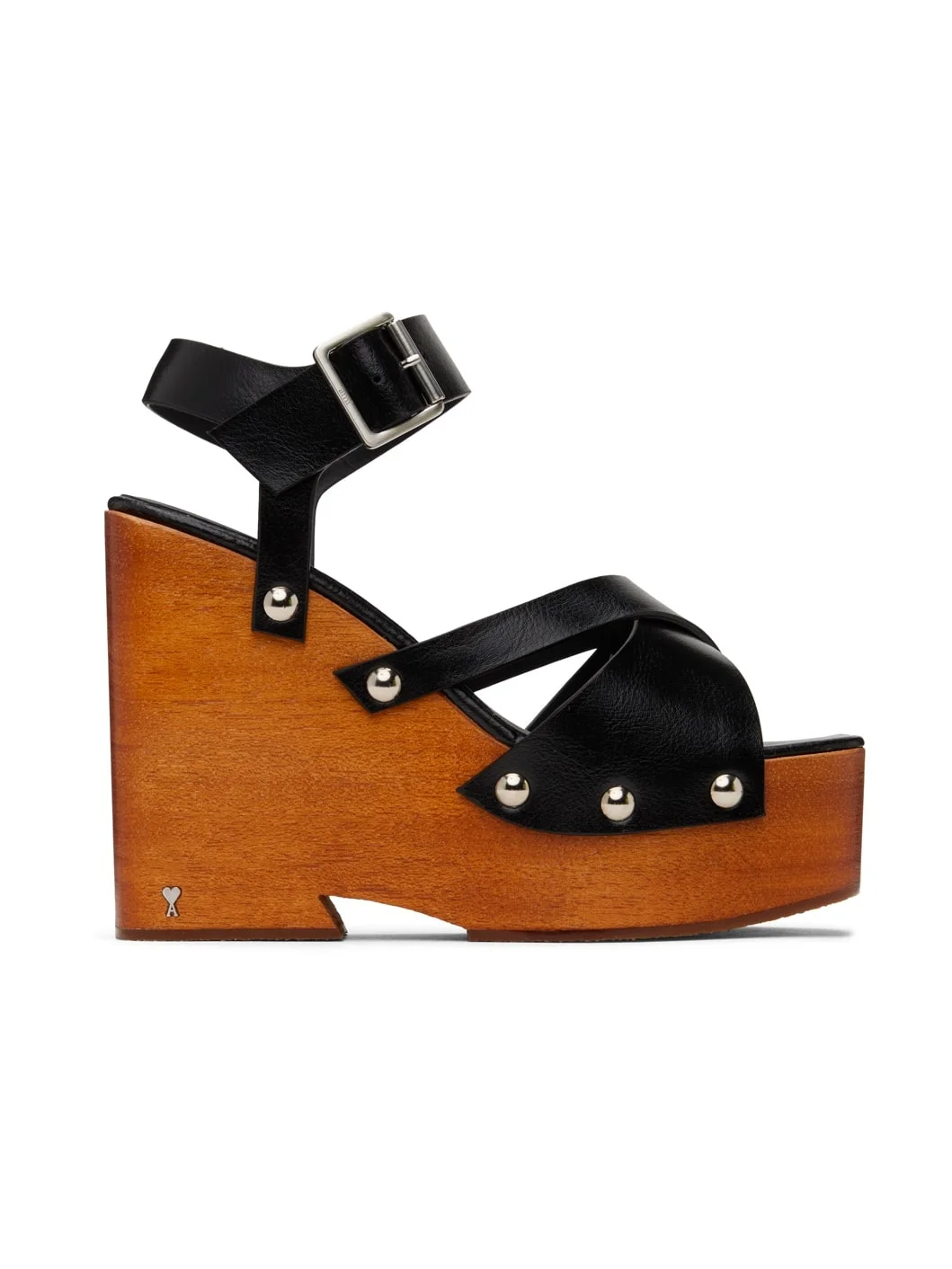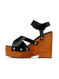 Grained leather heeled sandals in black. Studs and cutouts throughout. · Open square toe · Criss-crossing straps at vamp · Adjustable pin-buckle ankle strap · Padded leather footbed · Wood platform midsole and block heel · Logo hardware at heel · Textured rubber outsole · Silver-tone hardware · Platform: H1.25 in · Heel: H4.5 in Supplier color: Black Upper: leather. Sole: rubber. Made in Portugal 231482F125004