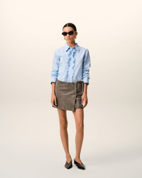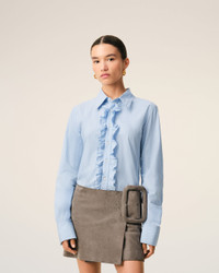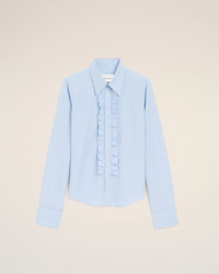 Fitted shirt with ruffles in striped cotton poplin. Fitted fit Classic collar Ami de coeur plate on the middle back Mother-of-pearl buttons on front placket Cufflinks on cuffs Made in Bulgaria (with love) REF: FSH821.CO0219.4844 SIZE & FIT This item is designed for a close fit. Take your normal size. Woman model is 176 cm / 5"7 and is wearing a size 36. COMPOSITION & CARE GUIDE Main Material : 100% Cotton Chlorine Prohibited Do Not Tumble Dry Cool Iron Machine Wash At 30°C Gentle Dry Clean Gentle