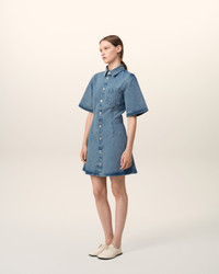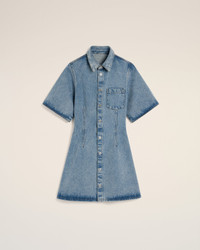 Short sleeve shirt dress in used indigo denim. Fitted fit 87 cm center back length (size S) Chest pocket Ami de Coeur rivet on chest pocket Denim snap buttons in nickel color Tobacco topstitches Made in Portugal (with love) REF: FDR404.DE0046.480 SIZE & FIT Fits true to size. Take your normal size. Model is 1m74 / 5'9" and is wearing a size XS. COMPOSITION & CARE GUIDE 100% Cotton Machine wash at 30°C Chlorine prohibited Do not tumble dry Medium iron Dry clean possible