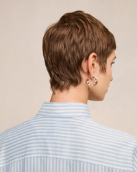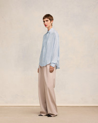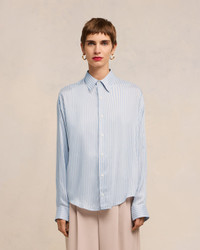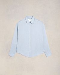 Striped silk and viscose canvas shirt. Boxy fit Unisex product 74 cm center back length (size XS) 77 cm center back length (size M) Tonal Ami de Coeur embroidery under collar Front tab and cuffs buttoned Mother-of-pearl buttons Made in France (with love) REF : USH126.VI0015.195 SIZE & FIT This style is unisex. For man, take your normal size. For woman, take one size down than your usual size. Man model is 1m83 / 6'0" and is wearing a size M. Woman model is 1m78 / 5'10" and is wearing a size XS. COMPOSITION & CARE GUIDE 82% Viscose, 18% Silk Chlorine prohibited Do not tumble dry Dry clean petroleum solvent only on a gentle process Cool iron Do not wash