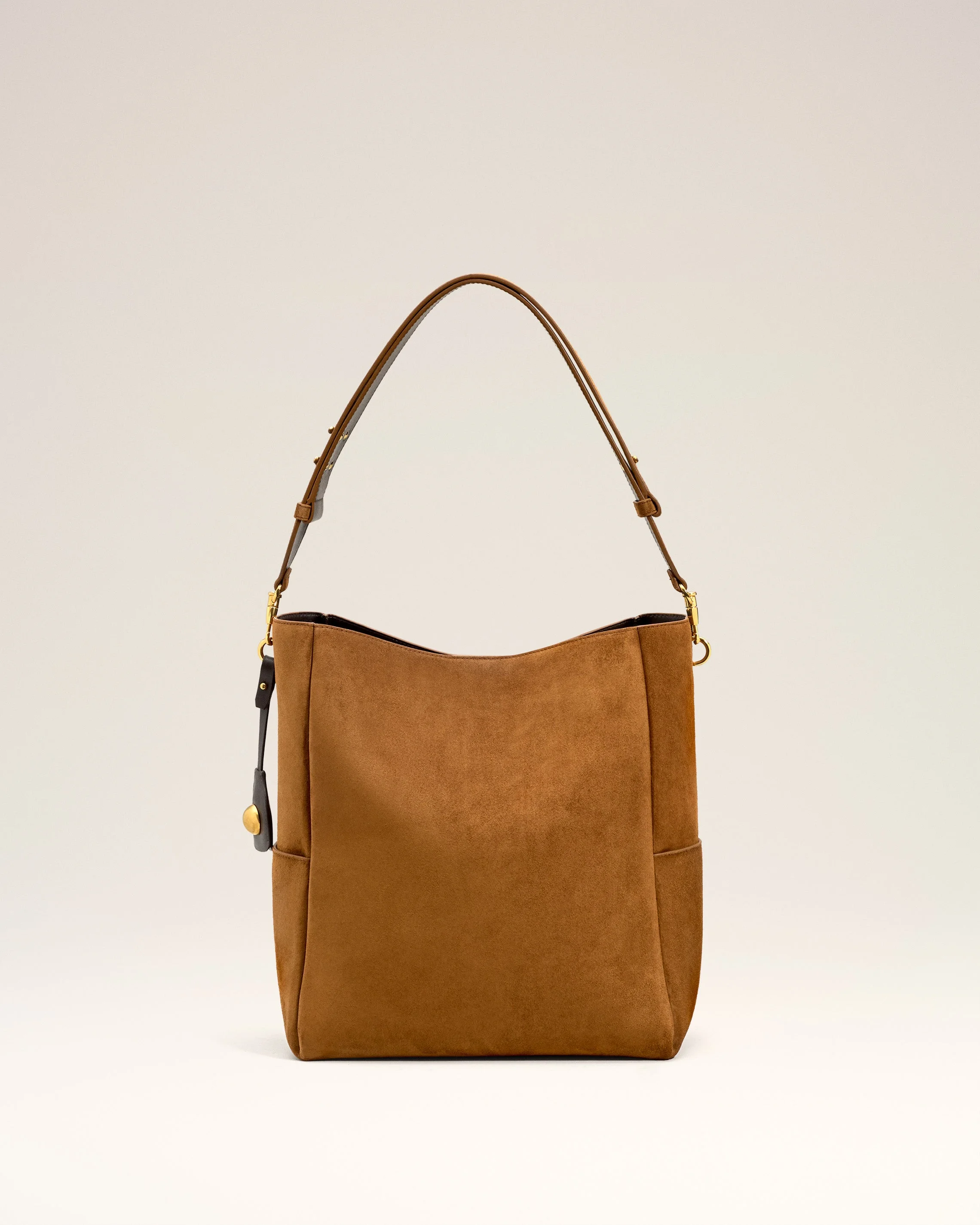 Carrousel bucket bag in suede leather and smooth leather. Unisex product Cow Leather Adjustable and removable leather strap, crossbody or shoulder carry Magnetic closure One main compartment with an inside patched pocket Two external side pockets Metal hardware in vibrated brass color Removable cloche keyring in leather, with half sphere in metal with engraved "ami alexandre mattiussi" logo Suede leather lining Size: 28 x 31.5 x 15 cm Made in Spain (with love) REF: ULL714.AL0136.216 SIZE & FIT Size: 28 x 31.5 x 15 cm COMPOSITION & CARE GUIDE Main Material : 100% Cow Leather Main Lining : 100% Calfskin Our leathergoods are made from delicate materials. To keep the original aspect of the leather as long as possible, please avoid contact with abrasive and oily substances. Make sure not to expose them at the direct light for too long and to wipe them with a soft and dry cloth when wet. To avoid deformations, insure to not overload them. Keep them in their dust bag and safe from humidity.