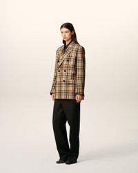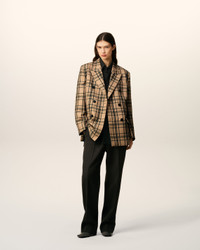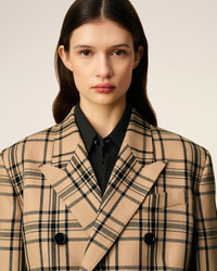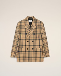 Double breasted jacket in checked wool gabardine. Loose fit Checked Notch collar Horn buttons 6 buttons double breasted 2 double piped pockets 1 chest piped pocket 3 inside pockets Buttoned cuffs 2 back slits Fully lined AMF stitches on the collar, lapel and flap pockets 77 cm center back length (size 36) Made in Romania (with love) REF: FBV002.WV0095.288 SIZE & FIT This item is designed to be worn lose. Take your normal size. Model is 181 cm / 5"11 and is wearing a size 36. COMPOSITION & CARE GUIDE Main Material : 100% New Wool Body Lining : 50% Polyester 50% Cotton Sleeves Lining : 54% Acetate 45% Viscose 1% Polyester Pocket Lining : 65% Polyester 35% Cotton Do not wash Chlorine prohibited Do not tumble dry Cool iron Dry clean gentle