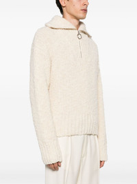 brushed half-zip jumper Alexandre Mattiussi goes back to his foundational roots with this ivory AMI Paris jumper – it’s inspired by the pieces he dreamed of making when he began designing 12 years ago. It’s brushed after being ribbed knit for a tactile finish and topped with an exaggerated point collar. Highlights - Ivory white - Merino wool blend - Ribbed knit - Brushed finish - Oversized pointed collar - Half front zip fastening - Drop shoulder - Long sleeves - Straight hem - When buying this unisex item, keep in mind that it is graded in standard men's sizing. Made in Italy Composition Wool 96%, Polyamide 4%
