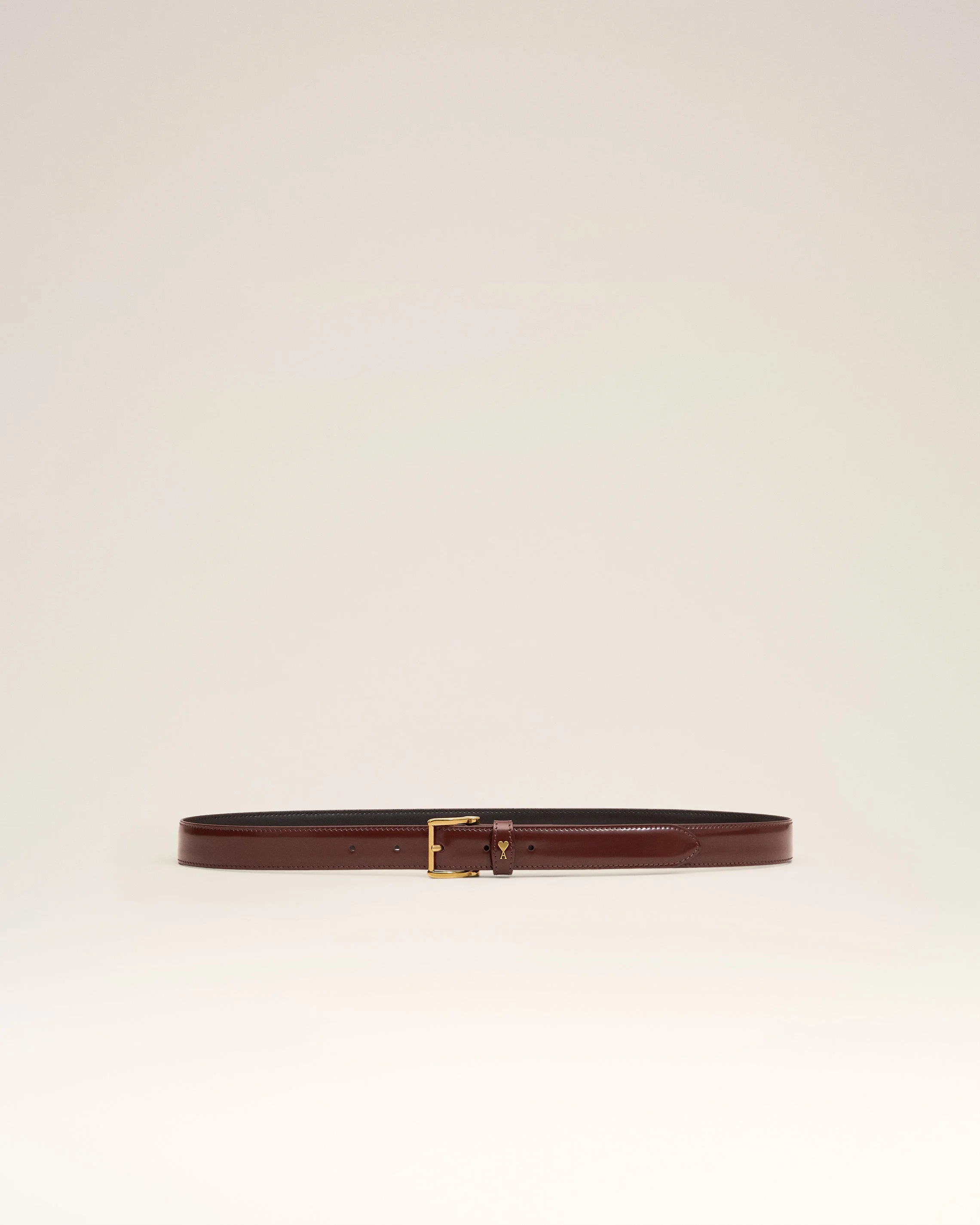 Paris Paris belt in glazed leather. Unisex product Metal buckle and Ami de Coeur stud in vibrated brass color Width: 25 mm Sizes: 75 / 85 / 95 / 105 Made in Spain (with love) REF: UBL029.AL0139.6925 SIZE & FIT Fits true to size. Take your normal size. COMPOSITION & CARE GUIDE Main Material : 100% Calfskin Main Lining : 100% Calfskin Do not wash