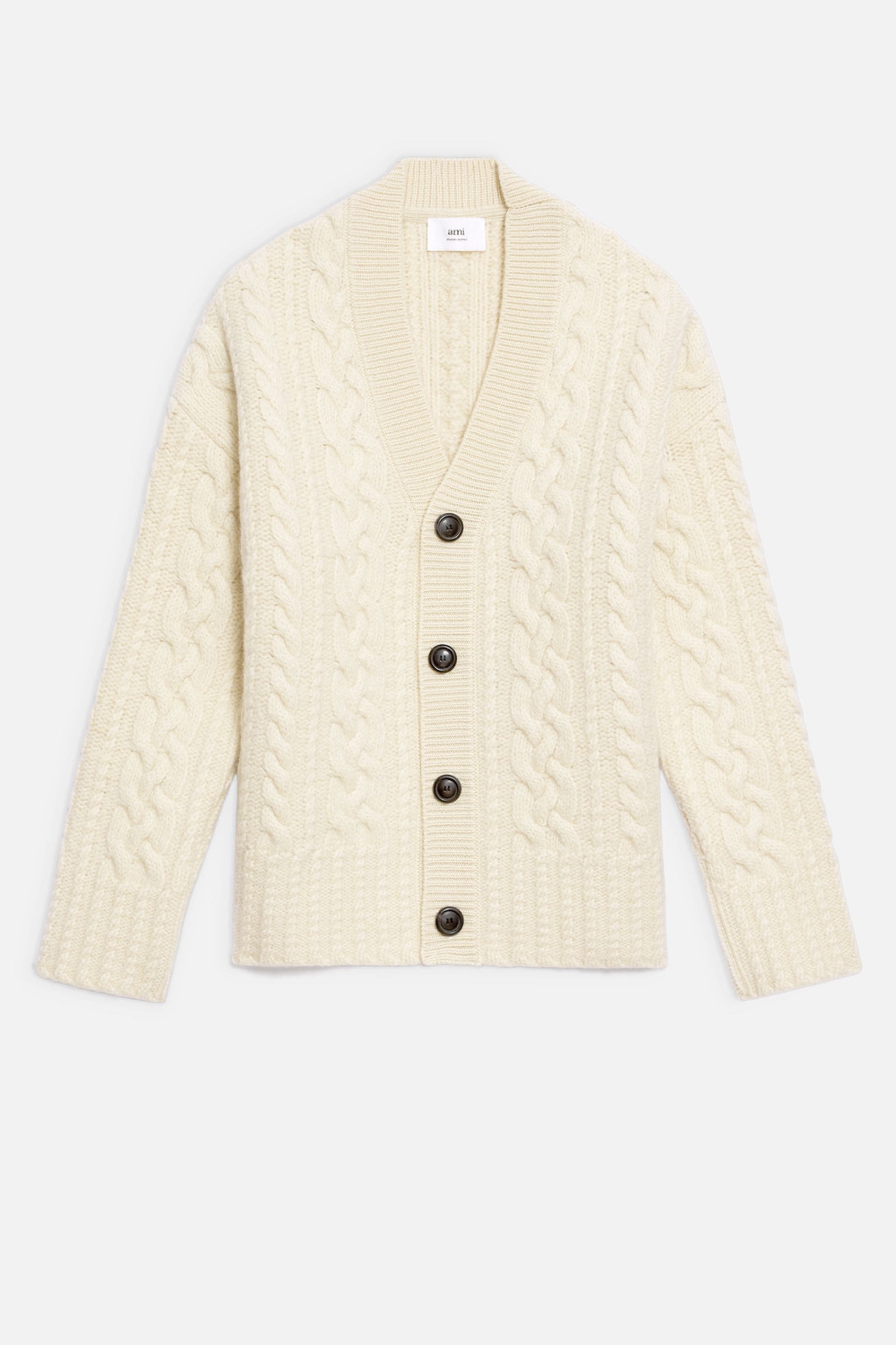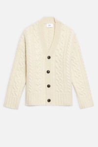 Product Description Cardigan in virgin woolUnisex productCable knit74cm middle back length (size M)67cm middle back length (size XS)AMI engraved black horn buttons Cardigan in virgin wool. - Unisex product - Cable knit - 74cm middle back length (size M) - 67cm middle back length (size XS) - ami engraved black horn buttons REF UKC151.017150 Size & Fit This style is unisex and it's design to be worn oversize. For man, take your normal size. For woman, take one size down than your usual size. Materials & Care Instructions Hand wash low temperature Do not bleach Do not tumble dry Dry flat Cool iron Dry clean gentle