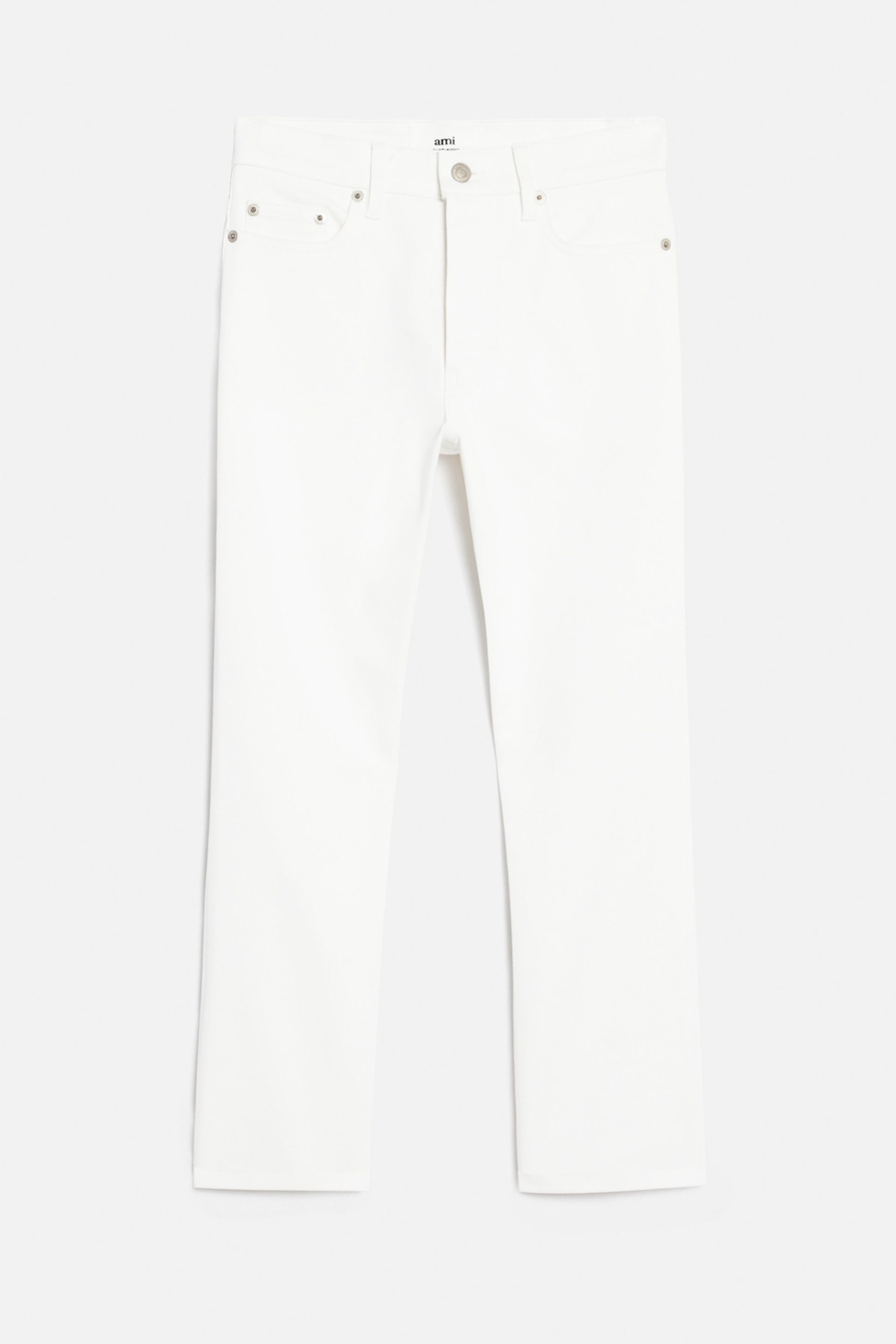 Product Description high-waisted cropped jeans from AMI Paris featuring white, cotton, high-waisted, cropped, front button and zip fastening, belt loops and classic five pockets. Cropped slim fit trousers in colored cotton twill. - Slim & cropped leg - 18 cm bottom leg width (size 26) - 5 pockets - Tonal topstitches - Zipped fly - Ami black patch on the back - Made in Portugal (with love) REF FTR610.CO0038168 Size & Fit Fits true to size. Take your normal size. Materials & Care Instructions 99% Cotton, 1% Elastane Machine wash at 30°C Do not bleach Do not tumble dry Line drying in the shade Cool iron Dry clean possible Wash inside out