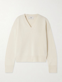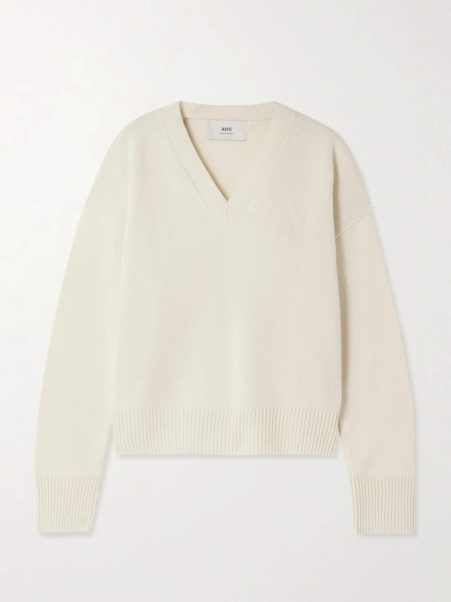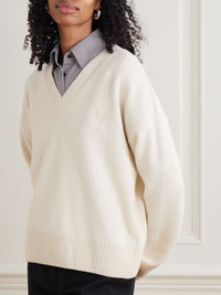 AMI PARIS' sweater is stitched with tonal threads that outline its signature 'Ami de Coeur' logo. It's been made in Italy from a soft wool and cashmere-blend with a V-neckline and ribbed trims. The oversized shape means there's plenty of room for layering. Size & Fit - Intended to be oversized; we recommend sizing down if you prefer a closer fit - Dropped shoulder seam - Mid-weight knit - Model is 177cm/ 5'10" and is wearing a size Small Model measurements: - Bust: 77cm/ 30.5" - Waist: 62cm/ 24.5" - Hip: 88cm/ 34.5" Details & Care - Ivory wool and cashmere-blend - Slips on - 90% wool, 10% cashmere - Unlined - Dry clean
