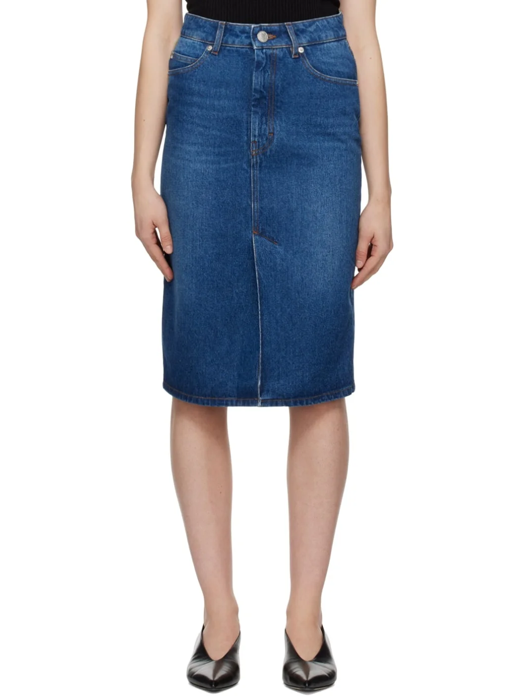 Product Description mid-length denim skirt from AMI Paris featuring indigo blue, cotton, faded effect, logo patch to the rear, high waist, belt loops, front button and zip fastening, classic five pockets, slit detailing and mid-length. Denim pencil skirt in mid washed indigo denim - 72 cm middle back lenght (size 26) - 5 pockets - Tobacco topstitches - Zipped fly - Black ami patch on the back REF FSK204.601480 Size & Fit Fits true to size. Take your normal size. Materials & Care Instructions Machine wash at 30°C Do not tumble dry Line drying in the shade Medium iron Dry clean possible Wash inside out