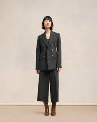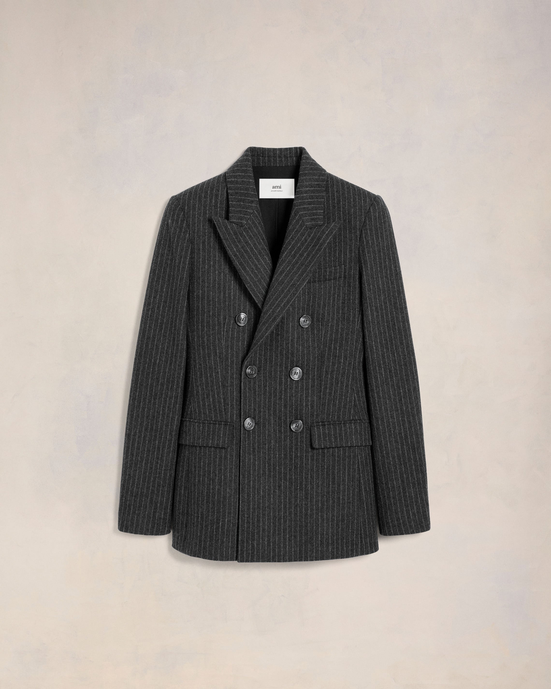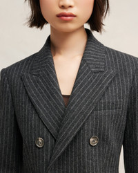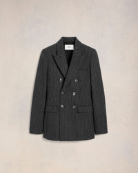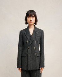 Double breasted jacket in striped wool flannel. Regular fit 73 cm center back length (size 36) Lined Double breasted Peak collar Welt chest pocket Flap pockets Inside pockets Slit middle back Bottom sleeves buttoned Horn buttons Made in Romania (with love) REF : FBV217.WV0048.0511 SIZE & FIT Fits true to size. Take your normal size. Model is 1m76 / 5'9" and is wearing a size 36. COMPOSITION & CARE GUIDE 100% New Wool Do not wash Chlorine prohibited Do not tumble dry Cool iron Dry clean petroleum solvent only on a gentle process